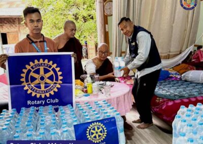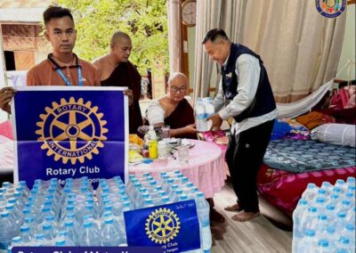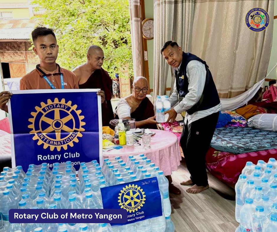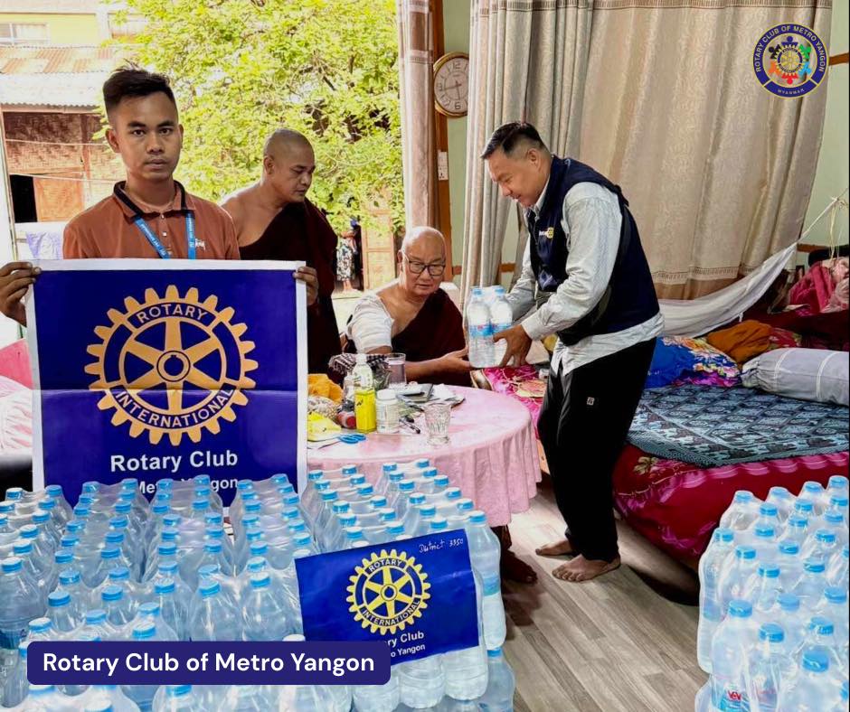 Due to the earthquake, the monastery’s headrest collapsed, buildings were damaged, and boundary walls crumbled, while two novice monks were injured. In response to this situation, the Rotary Club of Metro Yangon (RCMY) donated 330 purified water bottles for the 20 novice monks and 11 senior monks at the monastery.